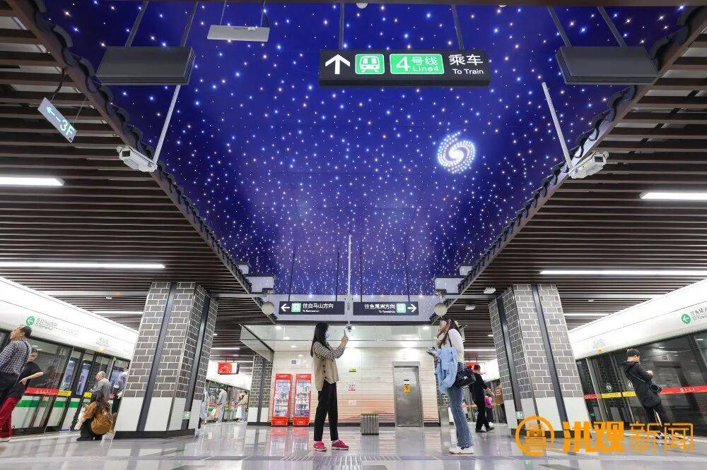 南昌地铁的“颜值”与“内涵”,早已成为这座英雄城的一张新文旅名片。八一广场站的《回眸展望》文化墙,萃取城市地标建筑与抽象山水元素,以科技感编排串联起南昌古今发展脉络,藏着英雄城的厚重底蕴;绳金塔站将白墙青砖、古剑金绳等历史元素与星空元素相融,抬头可见璀璨“星辰”,低头皆是历史印记,让千年古塔的厚重与星空的浪漫在此碰撞交织;怀玉山大道站则主打“赛博朋克”风格,提取网络虚拟符号打造智能空间,尽显南昌的现代化与数字化活力,成为年轻群体打卡的热门站点。“本来是坐地铁去绳金塔景区,结果在站内就拍了半个多小时。”来自武汉的游客吴晴笑着说道。
